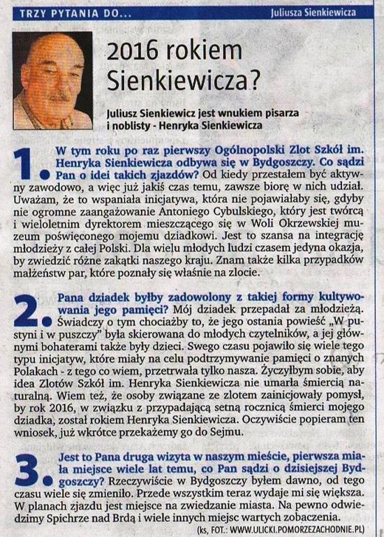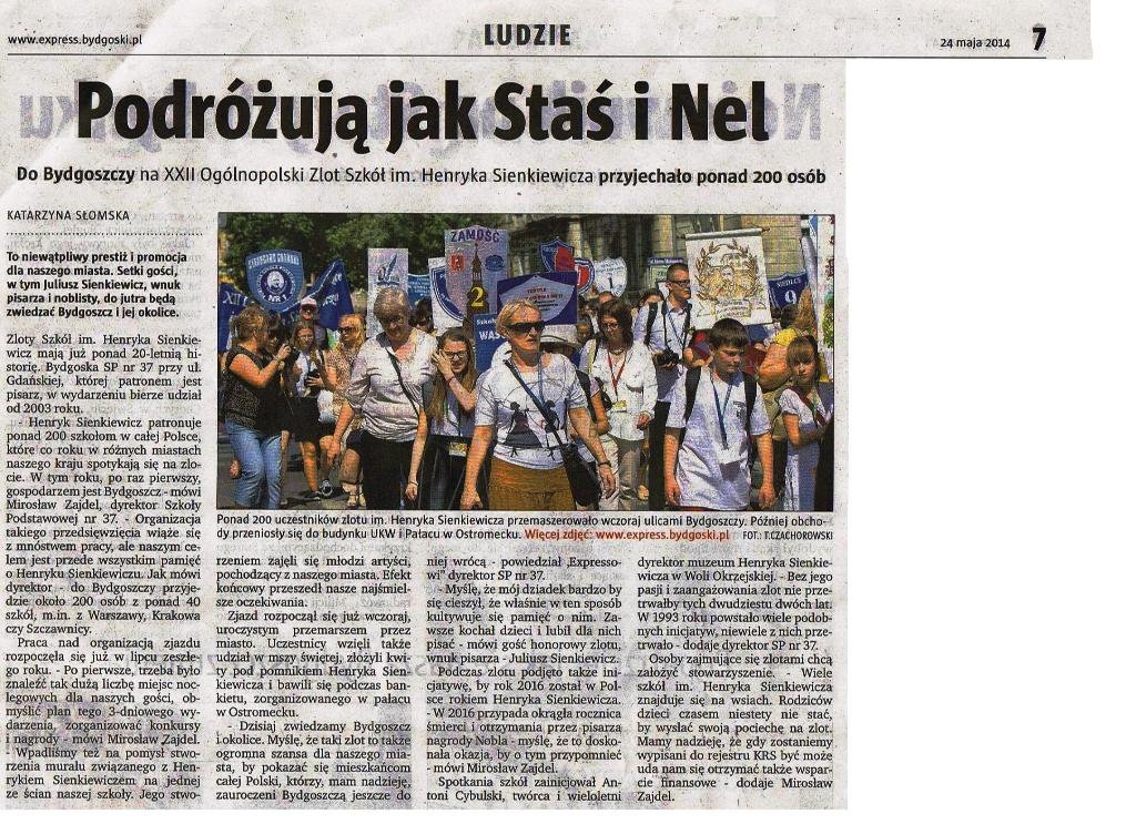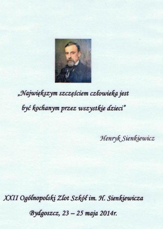 W dniach 23-25 maja w Bydgoszczy odbył się XXII Ogólnopolski Zlot Szkół Sienkiewiczowskich. Gospodarzem cyklicznego spotkania, była Szkoła Podstawowa nr 37 w Bydgoszczy. Brać Sienkiewiczowska spotyka się od 1993 roku w różnych miejscach w kraju z inicjatywy dyrektora Muzeum Henryka Sienkiewicza w Woli Okrzejskiej - Antoniego Cybulskiego, organizatora I Zlotu w Woli Okrzejskiej i współorganizatora następnych w Łańcucie, Wąsoszach, Woli Okrzejskiej, Łowiczu, Kościelcu k. Legnicy, Krakowie, Warszawie, Szczecinie, Poznaniu, Myszkowie, Szydłowcu, Ziębicach, Zamościu, Kołobrzegu, Olecku, Szczawnicy, Przemyślu, Starogardzie Gdańskim, Gnieźnie.