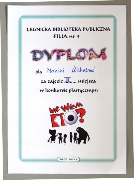 Uczennica klasy III - Monika Wilhelmi zdobyła 3 miejsce w konkursie plastycznym na podstawie wiersza Danuty Wawiłow pt. "Nie wiem kto". Konkurs był zorganizowany przez Legnicką Bibliotekę Publiczną - Filia nr 5.