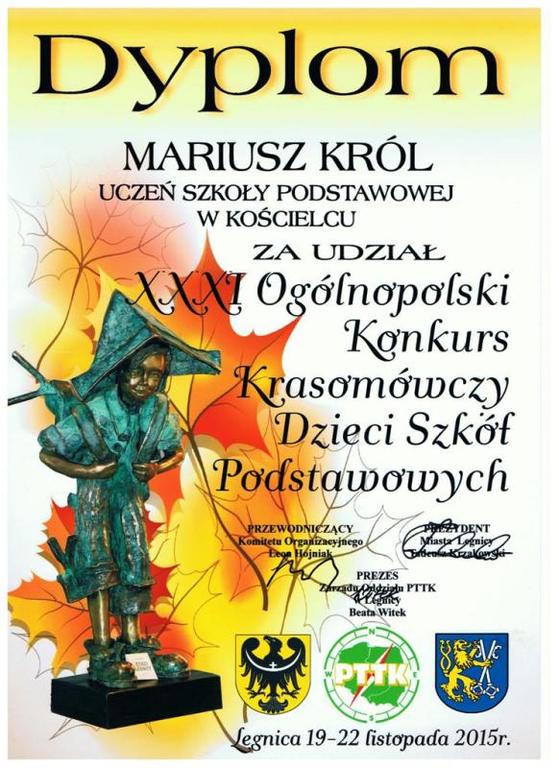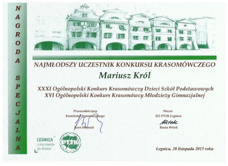 Legnica od 1984 roku jest nieprzerwanie organizatorem Ogólnopolskiego Konkursu Krasomówczego. Co rok w listopadzie Legnica staje się stolicą krasomówców, którzy przyjeżdżają tu na święto polszczyzny. XXXI Ogólnopolski Konkurs Krasomówczy Dzieci Szkół Podstawowych i XVI Ogólnopolski Konkurs Krasomówczy Młodzieży Gimnazjalnej odbył się w dniach 19 - 21 listopada 2015 roku w Legnicy. Organizatorami Konkursu byli: Zarząd Oddziału PTTK w Legnicy przy współpracy Centrum Kształcenia Zawodowego i Ustawicznego, Szkoła Podstawowej nr 19 w Legnicy, Szkoła Podstawowej nr 9 w Legnicy, IV Liceum Ogólnokształcącego w Legnicy. W Konkursie wzięło udział 52 uczestników (na 56 zgłoszonych do Konkursu) – 27 ze Szkół Podstawowych i 25 z Gimnazjów z 13 województw naszego kraju.