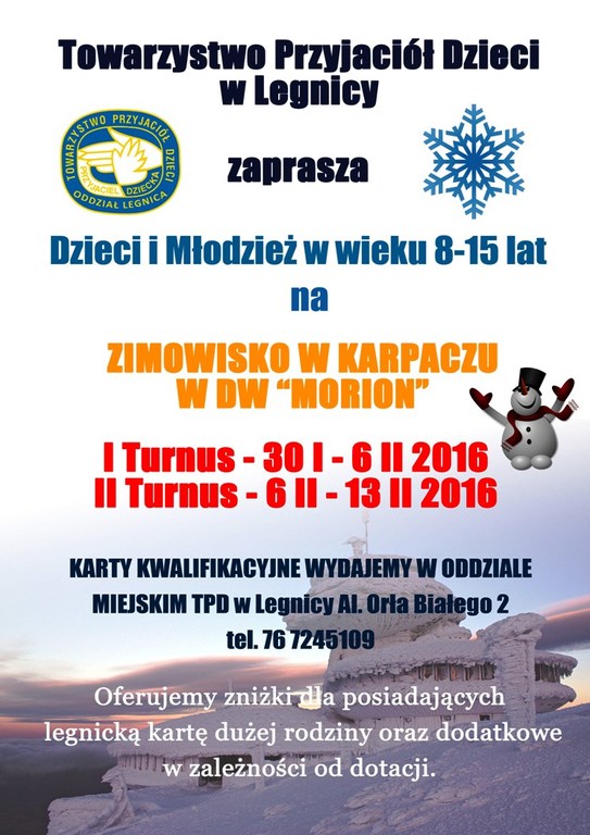 Towarzystwo Przyjaciół Dzieci w Legnicy zaprasza dzieci i młodzież na zimowisko do Karpacza. Szczegóły na załączonym plakacie.