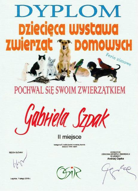 Jak co roku Legnicki Ośrodek Sportu i Rekreacji zorganizował dziecięcą wystawę zwierzątek domowych. W hali przy ulicy Lotniczej zaprezentowali się młodzi legniczanie wraz ze swoimi pupilami - psami, kotami, królikami czy świnkami morskimi. Wśród uczestników była nasza uczennica klasy 2 - Gabrysia Szpak ze swoja piękną świnka morską. Gabrysia i jej pupil zajęli II miejsce.