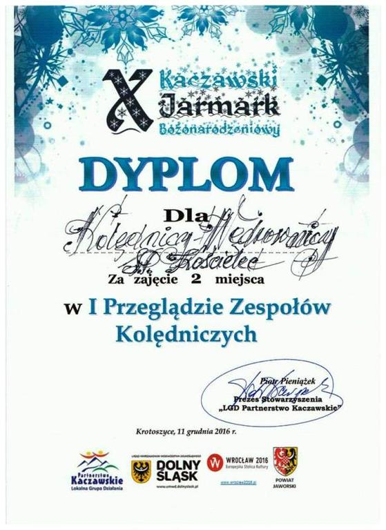W dniu 11 grudnia 2016 roku w Pałacu w Krotoszycach odbył się X Kaczawski Jarmark Bożonarodzeniowy. Jak co roku byliśmy tam obecni - przygotowaliśmy stoisko z przepięknymi stroikami i ozdobami świątecznymi oraz zaprezentowaliśmy występ zespołu kolędniczego złożonego z naszych uczniów. Nasza prezentacja w ramach I Przeglądu Zespołów Kolędniczych została oceniona bardzo wysoko i zajęliśmy 2 miejsce. Serdecznie dziękujemy wszystkim (szczególnie rodzicom), którzy przyczynili się do przygotowania ozdób świątecznych. Poniżej zdjęcia (źródło: http://dolny-slask24h.pl/).