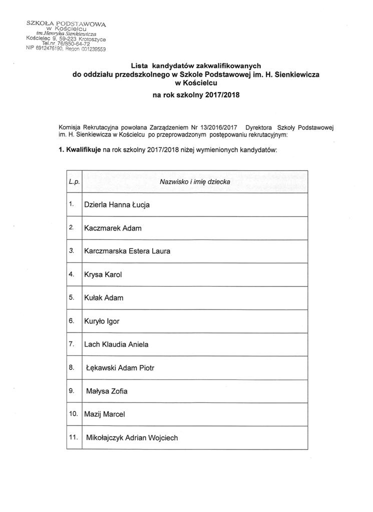 Poniżej prezentujemy listy kandydatów zakwalifikowanych do oddziału przedszkolnego i do klasy I Szkoły Podstawowej im. H. Sienkiewicza w Kościelcu.