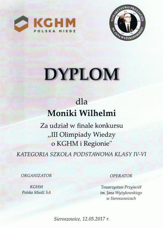 Z przyjemnością informujemy, że uczennica naszej szkoły - Monika Wilhelmi zakwalifikowała się do ścisłego finału "III Olimpiady Wiedzy o KGHM i Regionie". Zmagania finałowe odbyły się w Sali Miedziowej w Sieroszowicach. To był debiut Moniki. Liczymy, że w przyszłym roku co najmniej powtórzymy ten sukces. GRATULACJE DLA MONIKI!