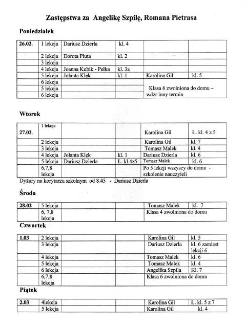 W związku z absencją chorobowa dwóch nauczycieli w dniach 26.02 - 02.03.2018 r. obowiązywać będą zastępstwa zgodnie z załącznikiem.