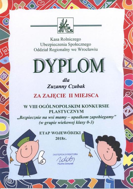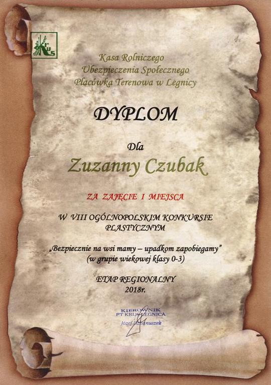 "Bezpiecznie na wsi mamy - upadkom zapobiegamy" to hasło przewodnie VIII edycji Ogólnopolskiego Konkursu Plastycznego organizowanego przez Kasę Rolniczego Ubezpieczenia Społecznego. Poprzez udział w konkursie promujemy pozytywne zachowania związane z pracą i zabawą na terenie gospodarstwa rolnego. Zadanie konkursowe polegało na wykonaniu pracy plastycznej w dowolnej technice.