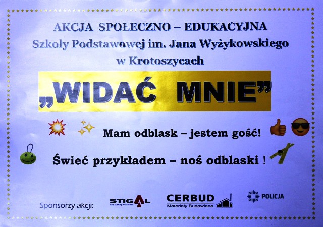 W dniu 31 stycznia 2020 roku do naszej szkoły przyjechała delegacja ze Szkoły Podstawowej im. Jana Wyżykowskiego w Krotoszycach. Uczniowie pod przewodnictwem pani dyrektor zapoznali nas z akcją społeczno – edukacyjną „WIDAĆ MNIE!”. Akcja ta składa się z wielu etapów i ma na celu poprawę bezpieczeństwa dzieci na drogach wiejskich, szczególnie w okresie zimowym.