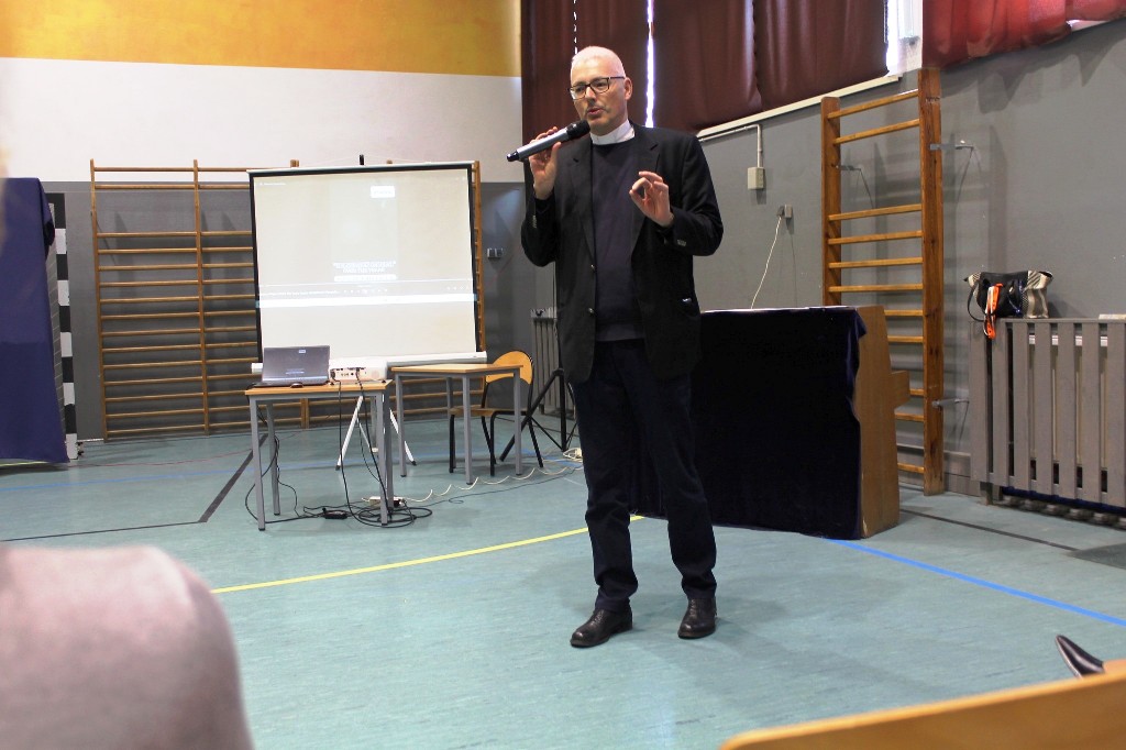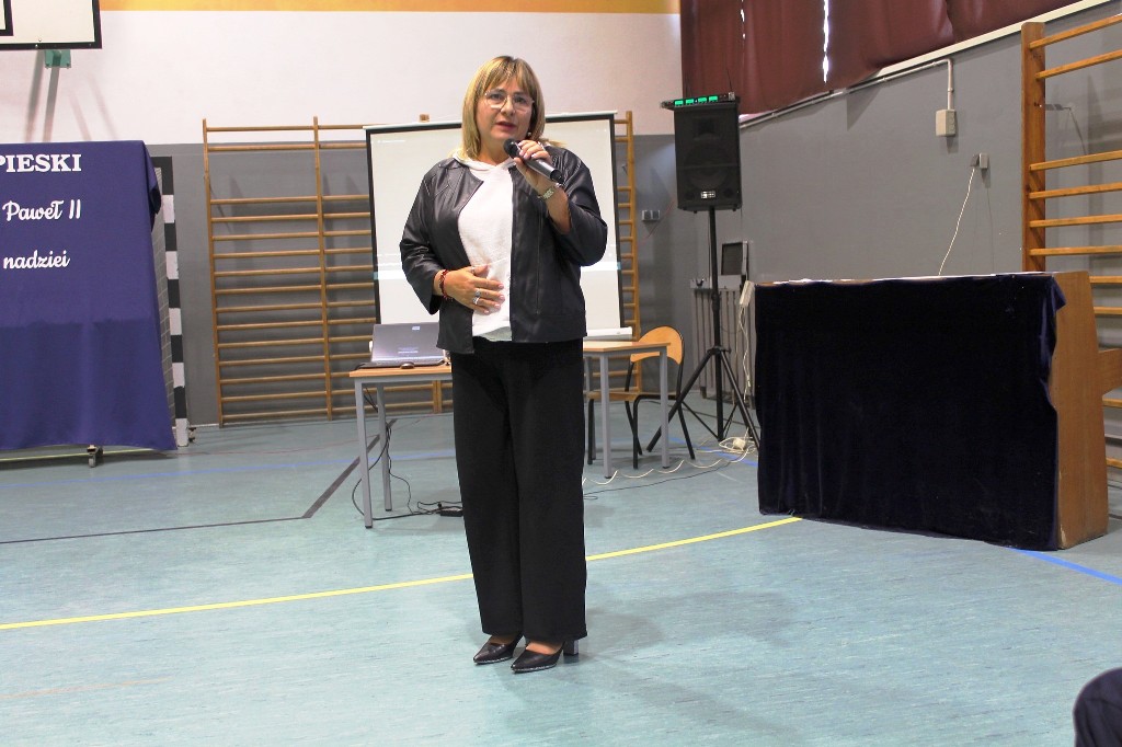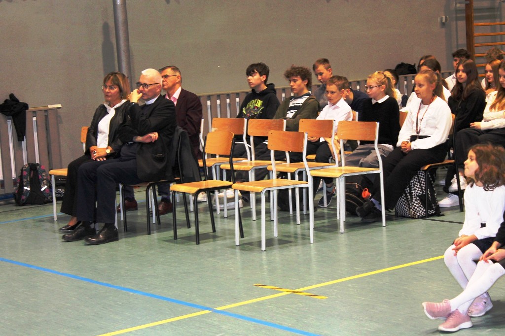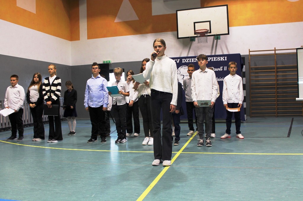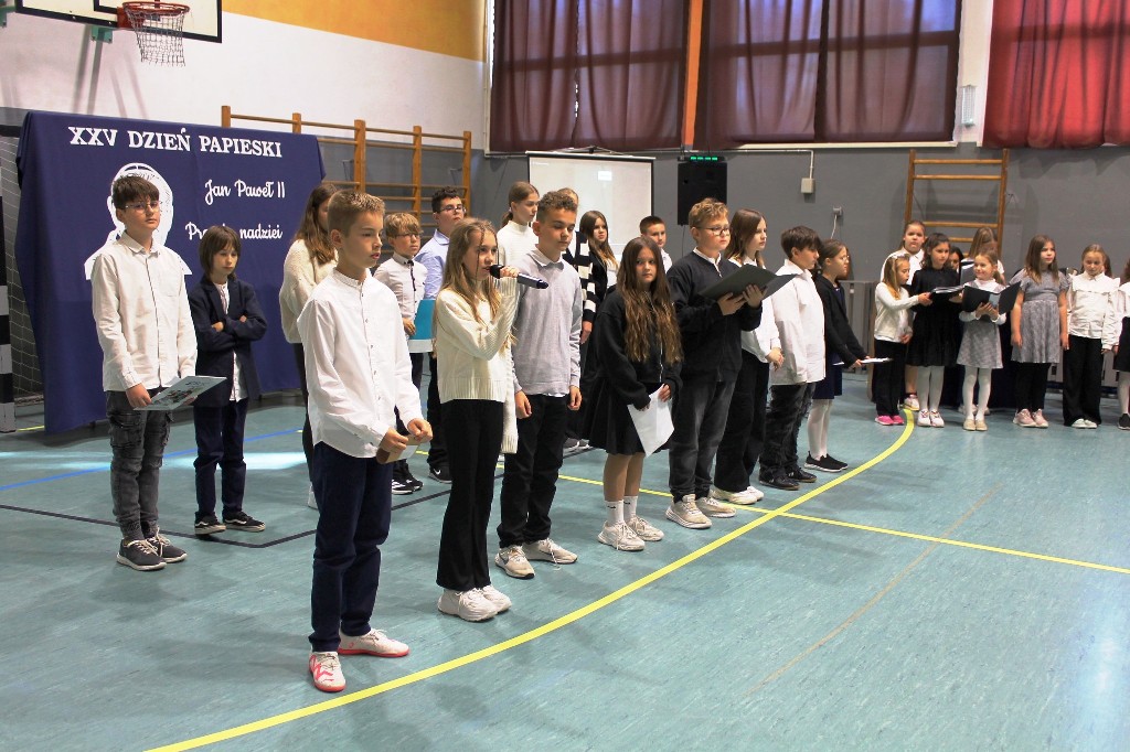Z tej okazji uczniowie klasy VI, pod kierunkiem pani katechetki przybliżyli nam postacie ostatnich 4 papieży i ich przesłania o nadziei, która nigdy nie umiera. Usłyszeliśmy głos, który przemawiał do milionów ludzi, a którego gesty inspirowały pokolenia, którego nadzieja przełamywała mury. Niezawodny chór szkolny jak zawsze uświetnił występ elementami muzycznymi, a przepiękna dekoracja w wykonaniu p. Joanny Kubik-Pełka zachwyciła wszystkich uczestników.